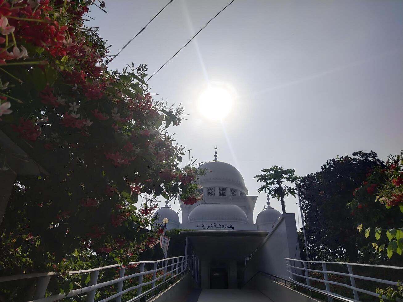 Sunlight shines brightly over a domed building with trees framing the view. A pathway leads towards the structure under a clear sky. Free Photo