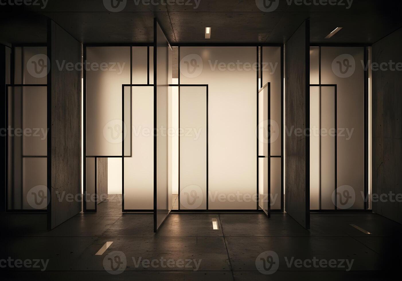 Striking modern architectural interior with geometric frosted glass partitions and concrete elements, creating an abstract, minimalist space bathed in subtle ambient light Pro Photo