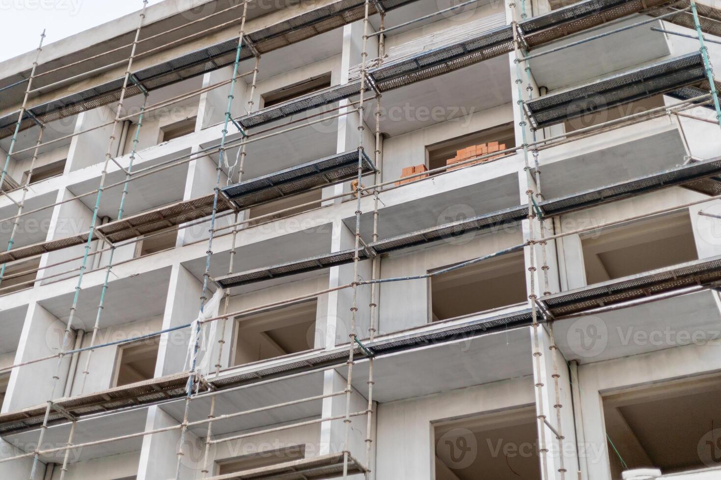 Workers are using scaffolding to access different levels of a multi-story building under construction. The image shows exposed walls and construction materials nearby Pro Photo