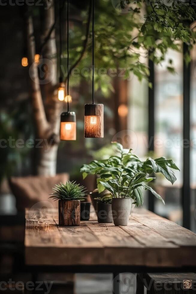 Potted plants sit on a wooden table below hanging lights with blurred tree branches in the background inside a cafe setting Pro Photo