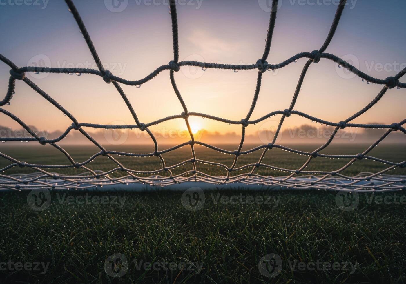 Atmospheric view through a soccer net covered in dew drops during foggy sunrise. Pro Photo