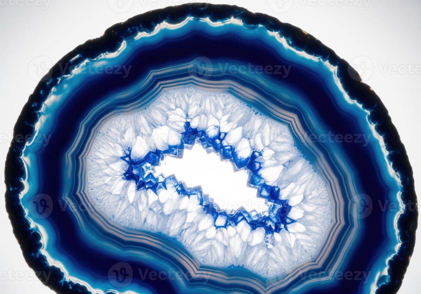 Abstract macro view of a vibrant blue agate slice showing translucent layers and quartz crystals. Pro Photo