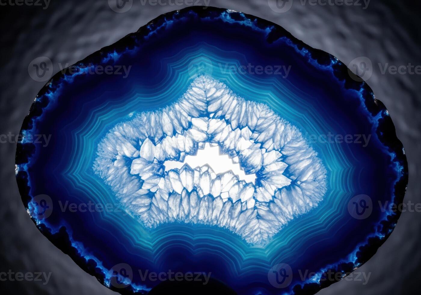 Backlit abstract macro view of vibrant blue agate geode mineral cross section Pro Photo