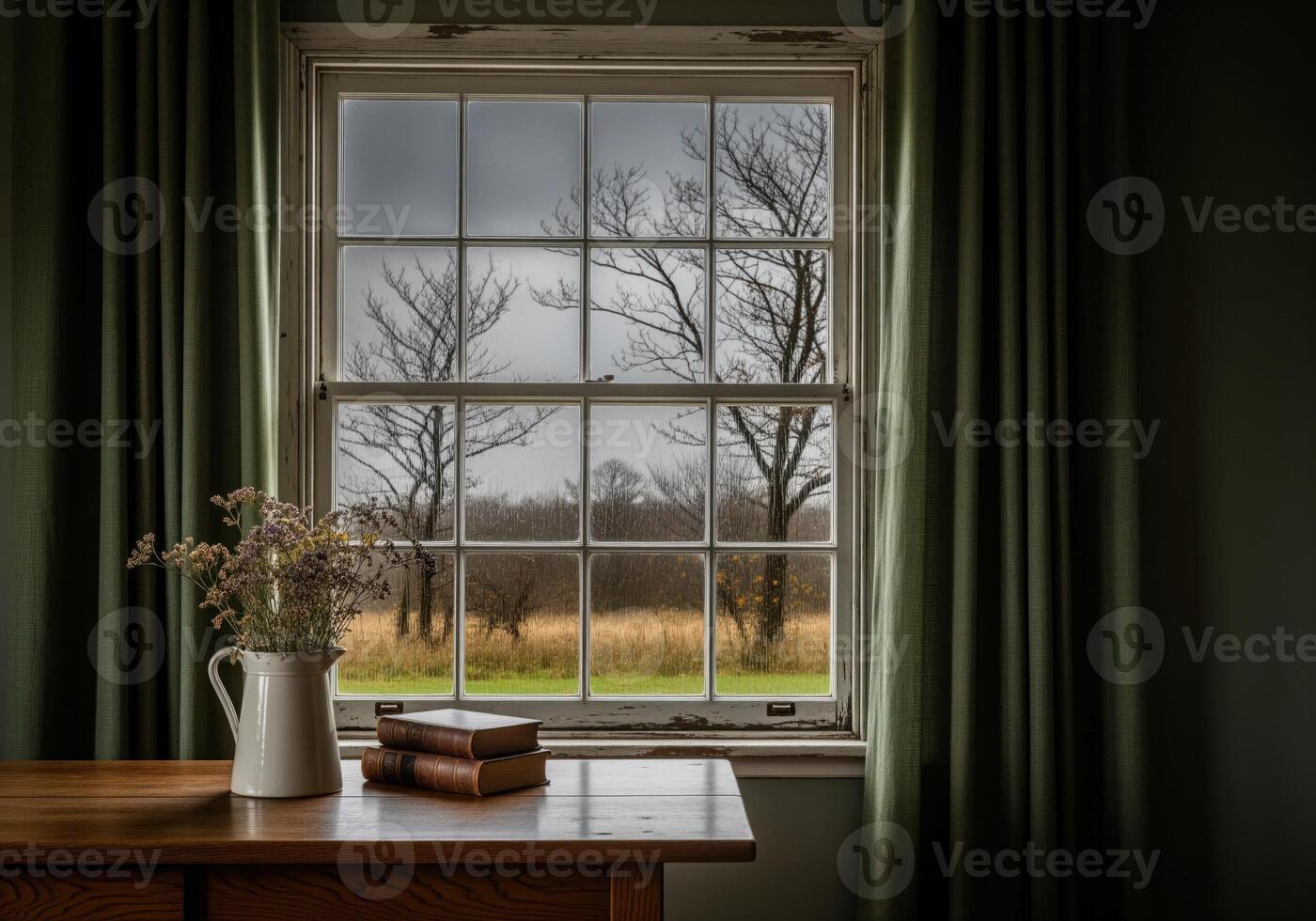 Rustic interior view through antique window frame showing bare trees and dark sky. Pro Photo