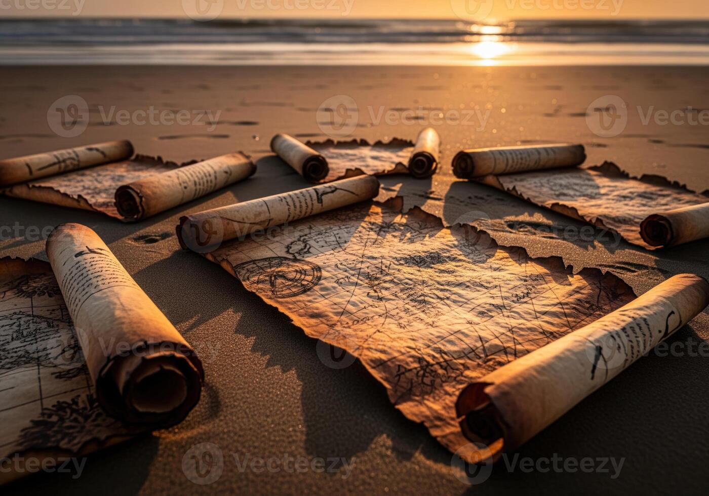 Weathered parchment scrolls and ancient maps scattered on a sandy beach at sunset Pro Photo
