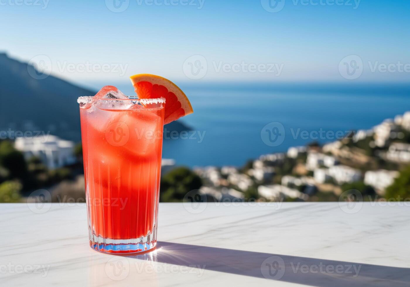 Sparkling ruby red paloma cocktail with ice and grapefruit wedge on a marble table overlooking the sea. Pro Photo
