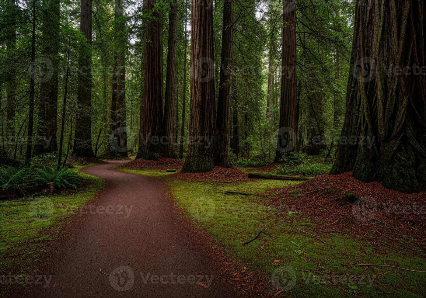 Quiet forest path winding through colossal ancient redwood trees in a lush environment. Pro Photo