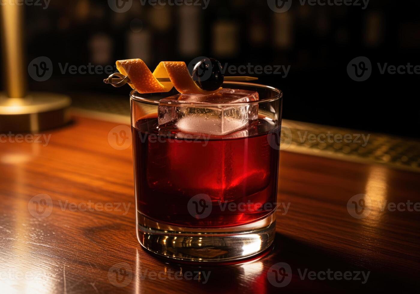 Deep ruby red classic cocktail with square ice cube and orange garnish on a dark bar counter Pro Photo