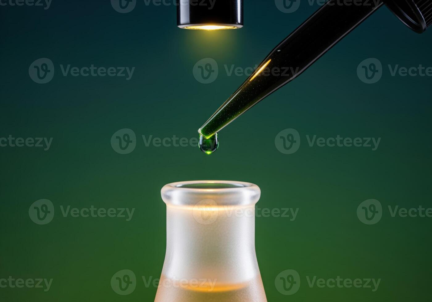 Green liquid drop falling from a pipette into a laboratory flask during a chemical experiment Pro Photo