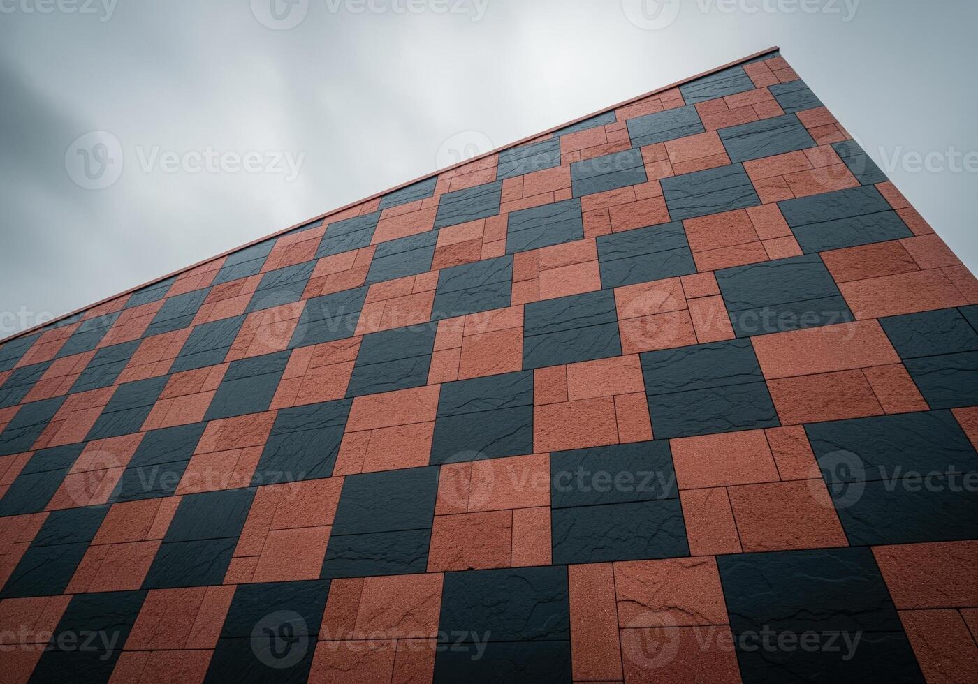 Striking geometric pattern on a modern building facade featuring contrasting red and black stone cladding. Pro Photo
