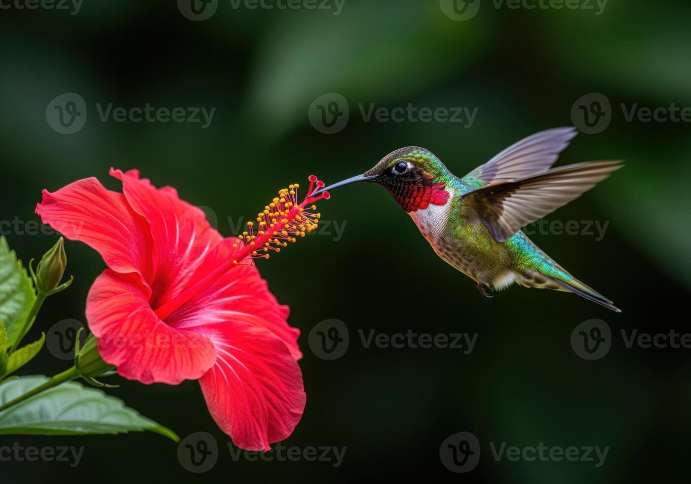 Ruby throated hummingbird hovering while feeding nectar from a bright red hibiscus flower Pro Photo