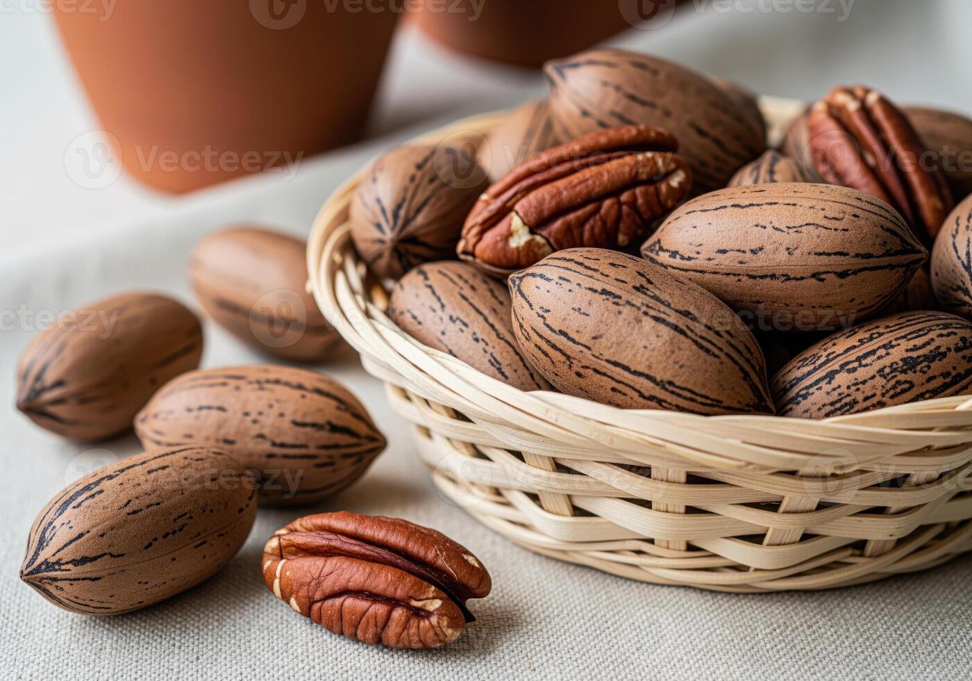 Close up of pecans in shell and shelled nuts displayed in a wicker basket on fabric Pro Photo
