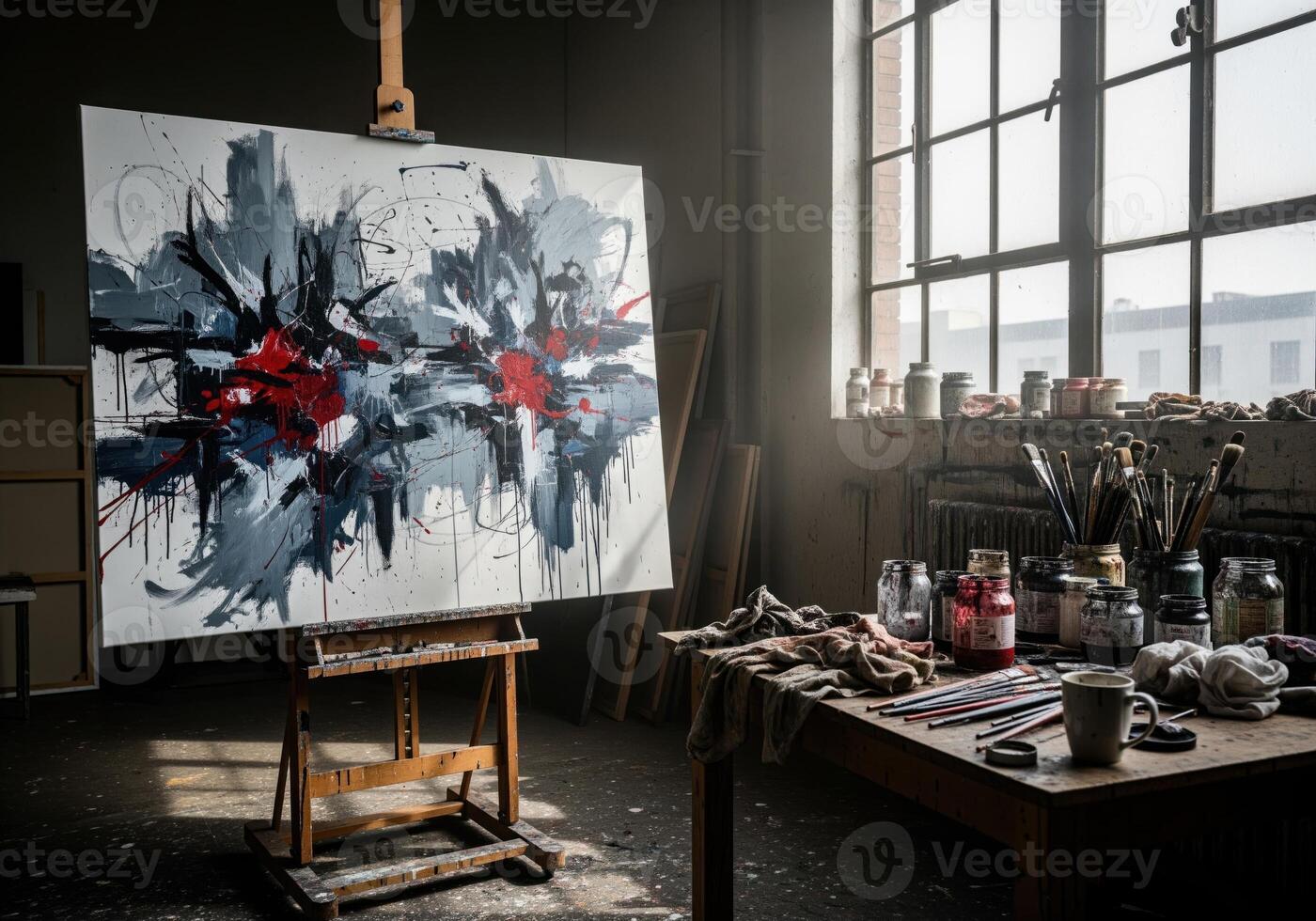 Abstract expressionism canvas on easel in artist studio with paints Pro Photo