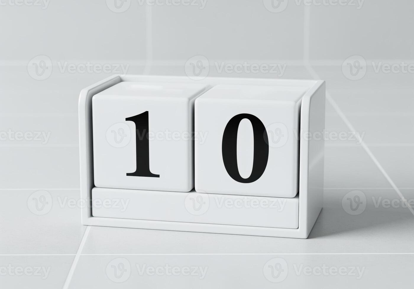 Minimalist white desk calendar displaying the date number 10 in bold black font. Pro Photo