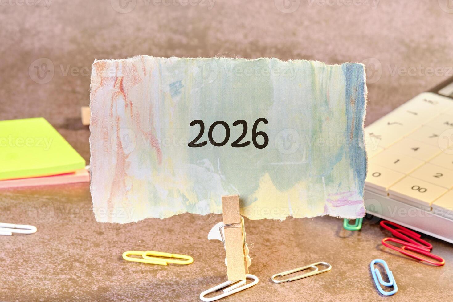 A colorful card displaying the year 2026 is held up by a clothespin against a soft, textured backdrop. Stationery items surround the scene, adding a creative touch Pro Photo