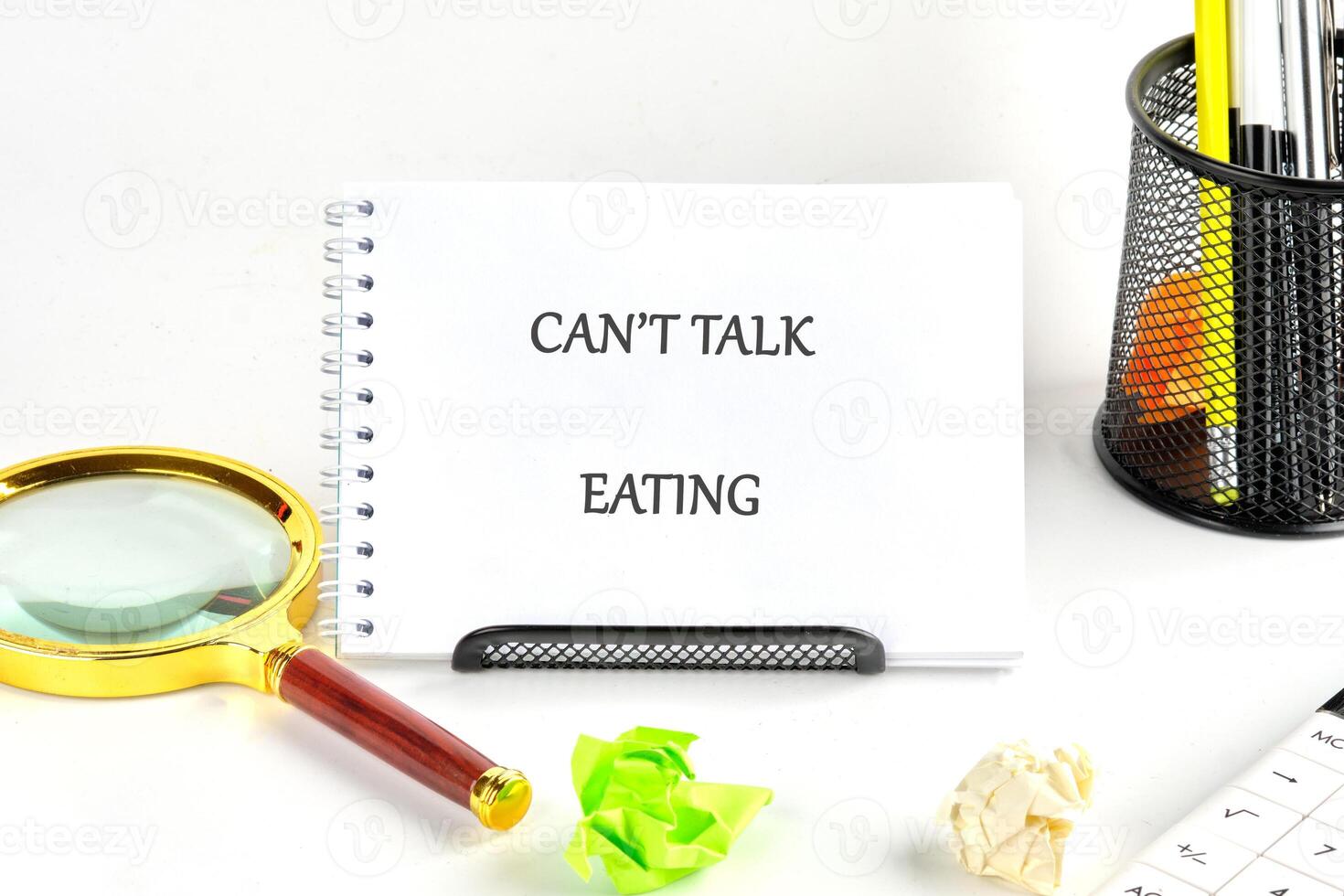 A bright workspace showcases a notebook with a clear message about not talking while eating Pro Photo