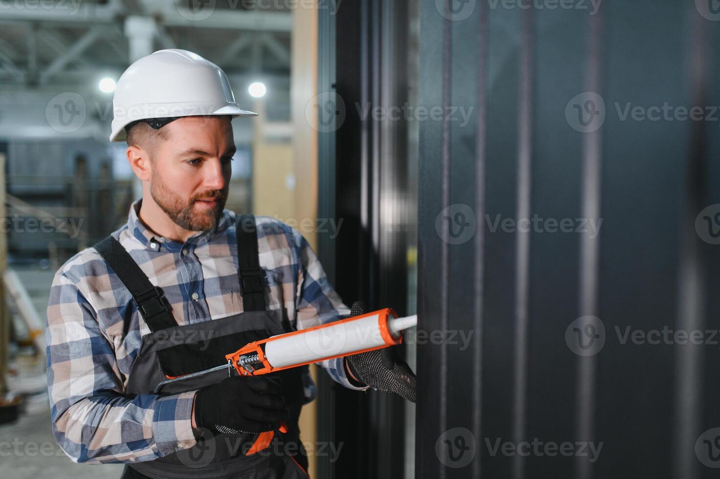 A worker is applying polyurethane foam to fill gap,between sash and window frame in prefabricated modular house Pro Photo
