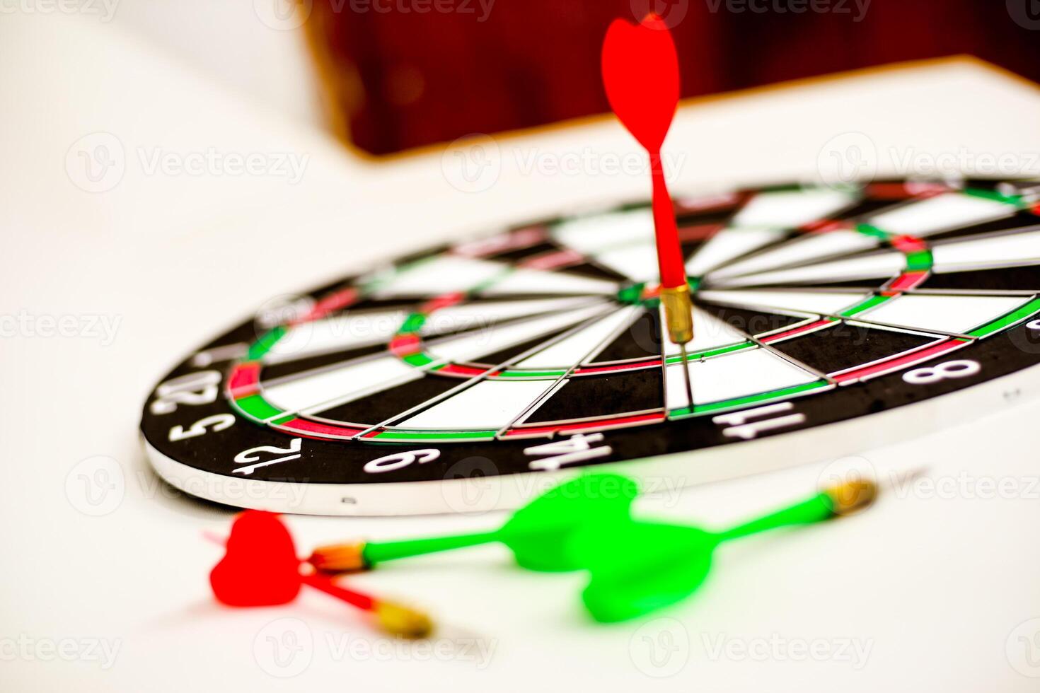 Close-up of dartboard with red dart in bullseye and other darts on surface, sharp focus Pro Photo