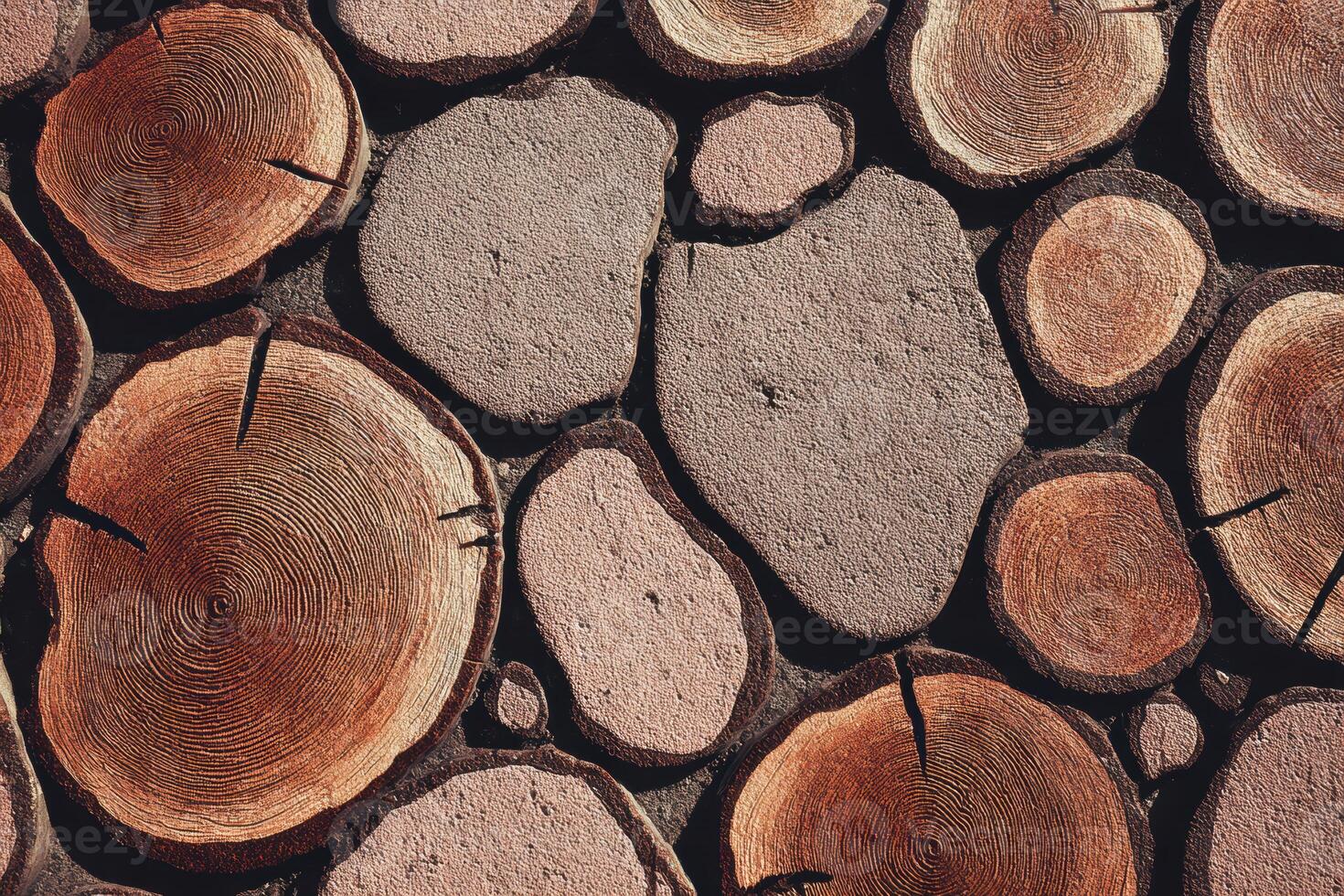 Wood slices arranged in a rustic pattern on the ground Pro Photo