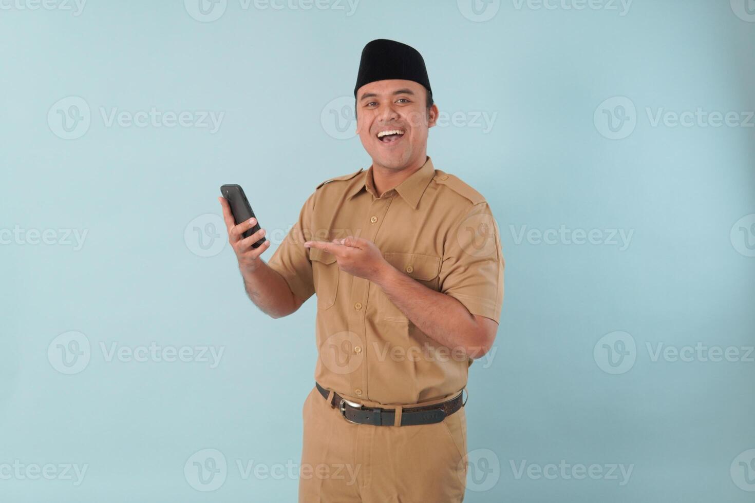 Smiling government worker with khaki uniform He is doing call while pointing to his smartphone PNS, ASN, civil servant concept, Pro Photo