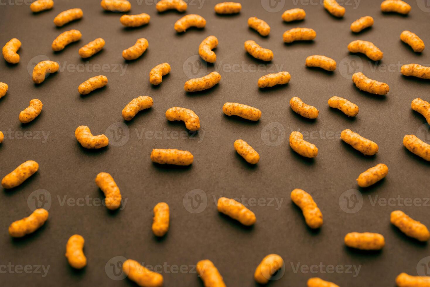 Peanut puff snacks arranged in geometric pattern on dark surface, shallow depth of field emphasizing texture and golden color contrast Pro Photo