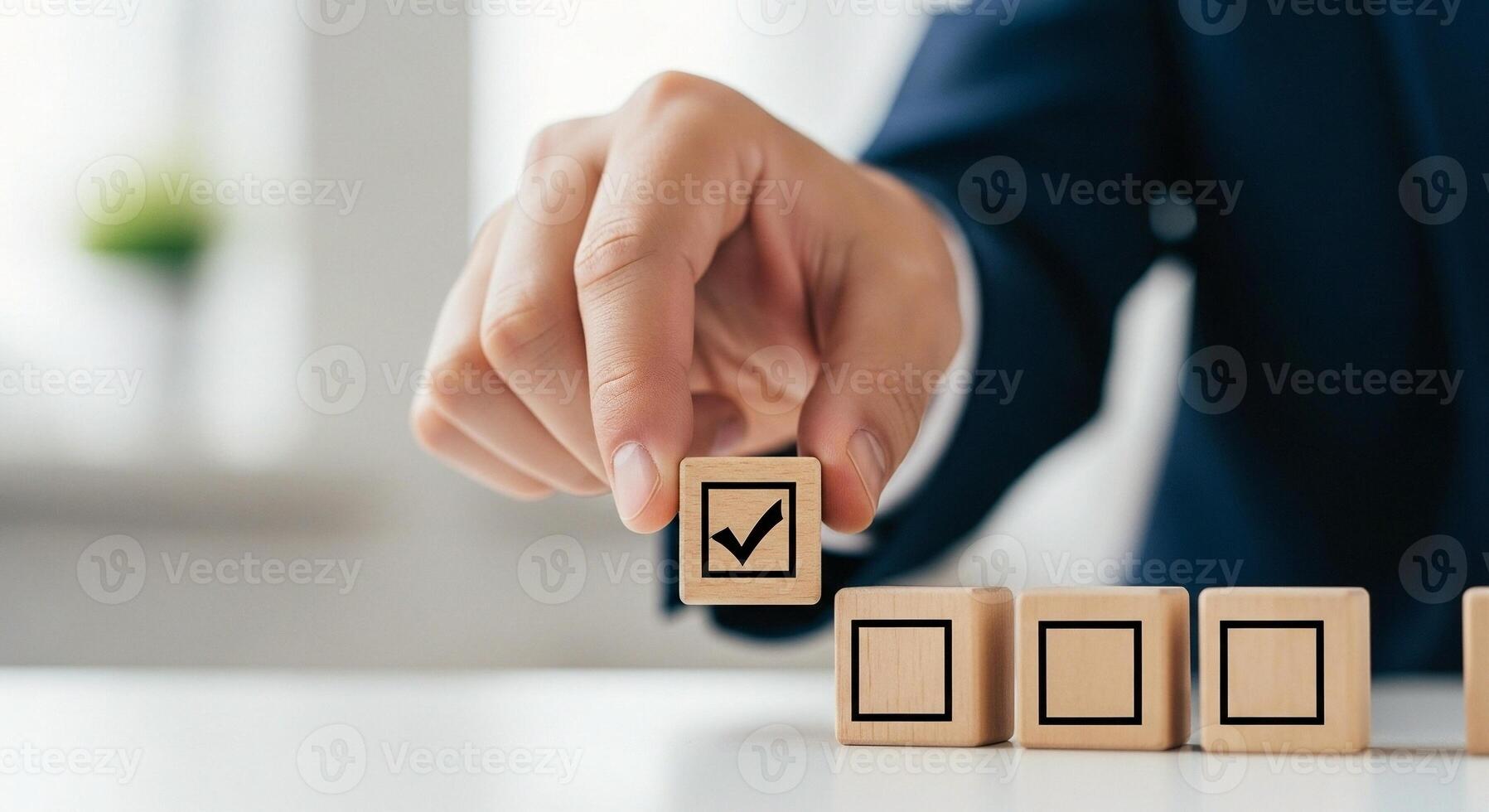 Hand Placing Checkmark Cube in Row of Options for Decision Making and Choices Pro Photo