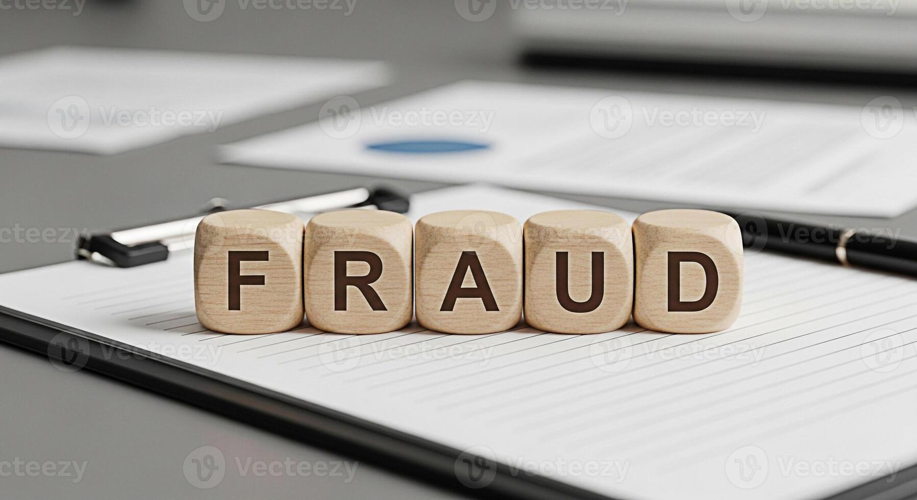 Wooden blocks spelling FRAUD on a clipboard in a professional office setting representing financial crime and the importance of fraud prevention and detection with a serious and cautionary mood Pro Photo