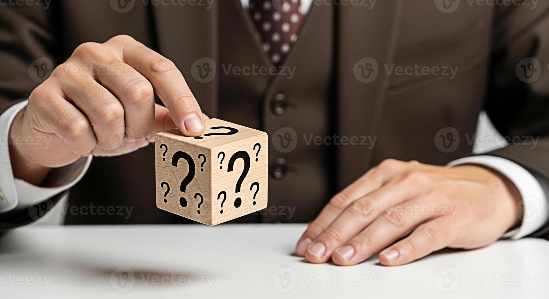 Contemplative businessman in a suit holding a wooden cube with question marks on a white desk symbolizing uncertainty and the need for strategic decisionmaking in a complex business environment Pro Photo