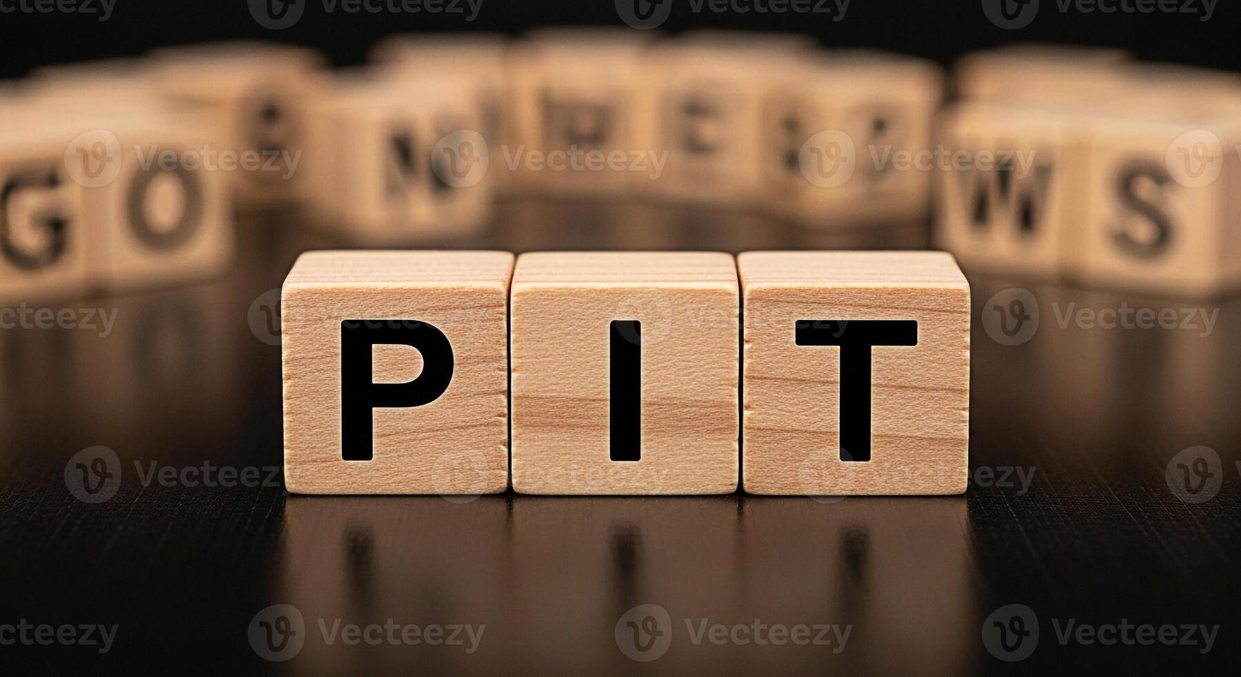 Wooden blocks spelling PIT on a dark surface conveying a sense of challenge and adversity symbolizing a difficult situation or setback with blurred background blocks adding depth and complexity Pro Photo