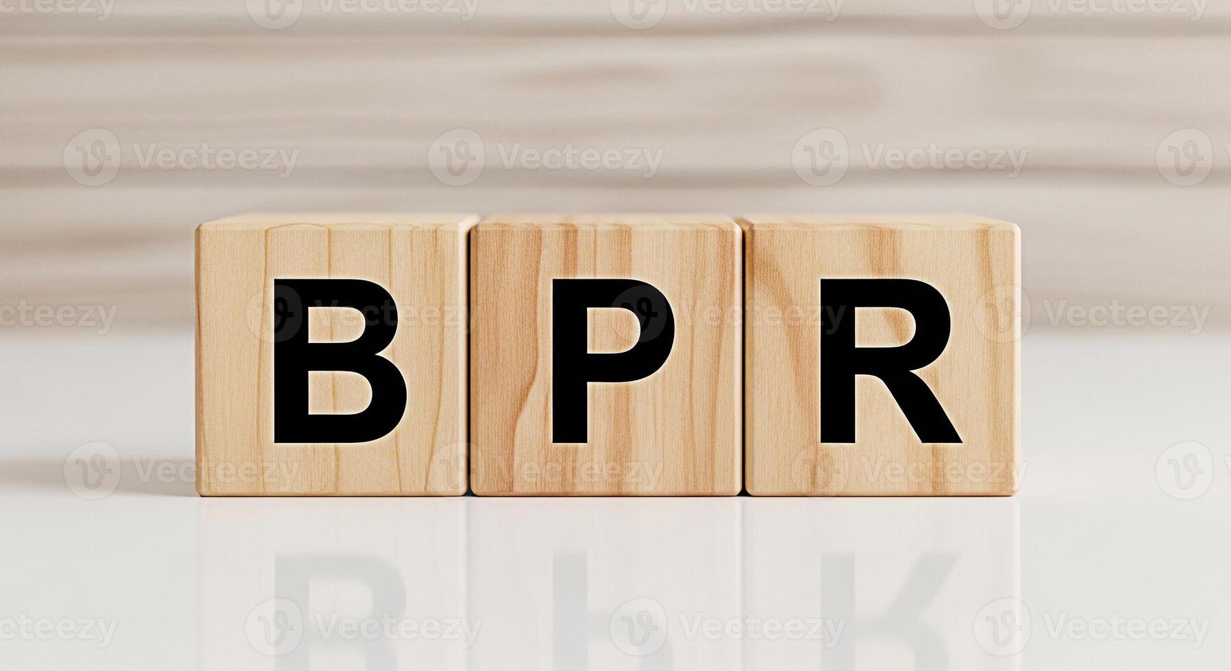 Wooden blocks displaying BPR on a reflective white surface symbolizing Business Process Reengineering in a clean and minimalist setting conveying a message of efficiency and strategic improvement Pro Photo