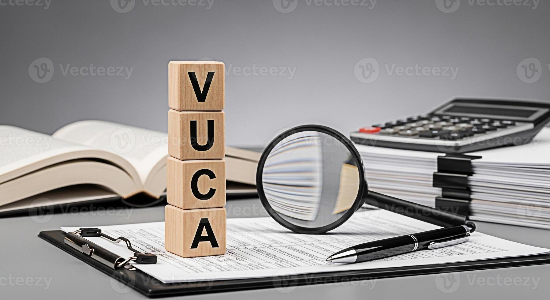 Wooden blocks spelling VUCA on a desk with paperwork magnifying glass and calculator representing volatility uncertainty complexity and ambiguity in a business environment conveying a sense of analysi Pro Photo