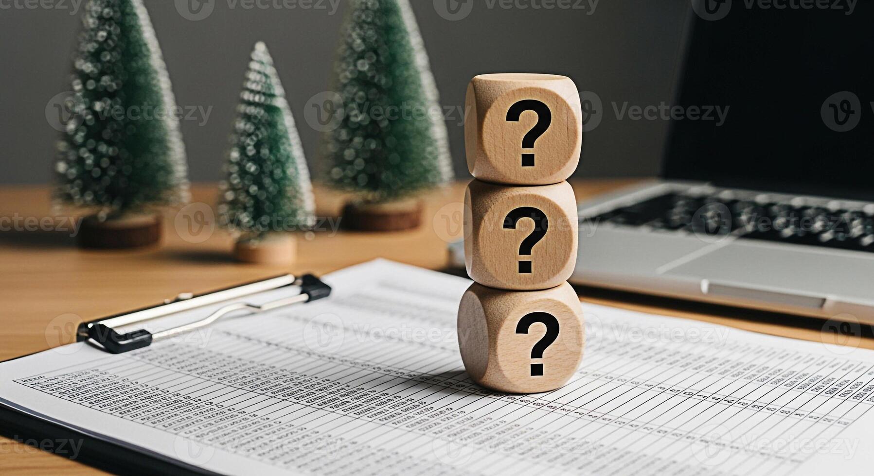 Stacked wooden blocks displaying question marks on a desk with a laptop and Christmas trees symbolizing uncertainty and problemsolving during the holiday season in a modern office setting Pro Photo