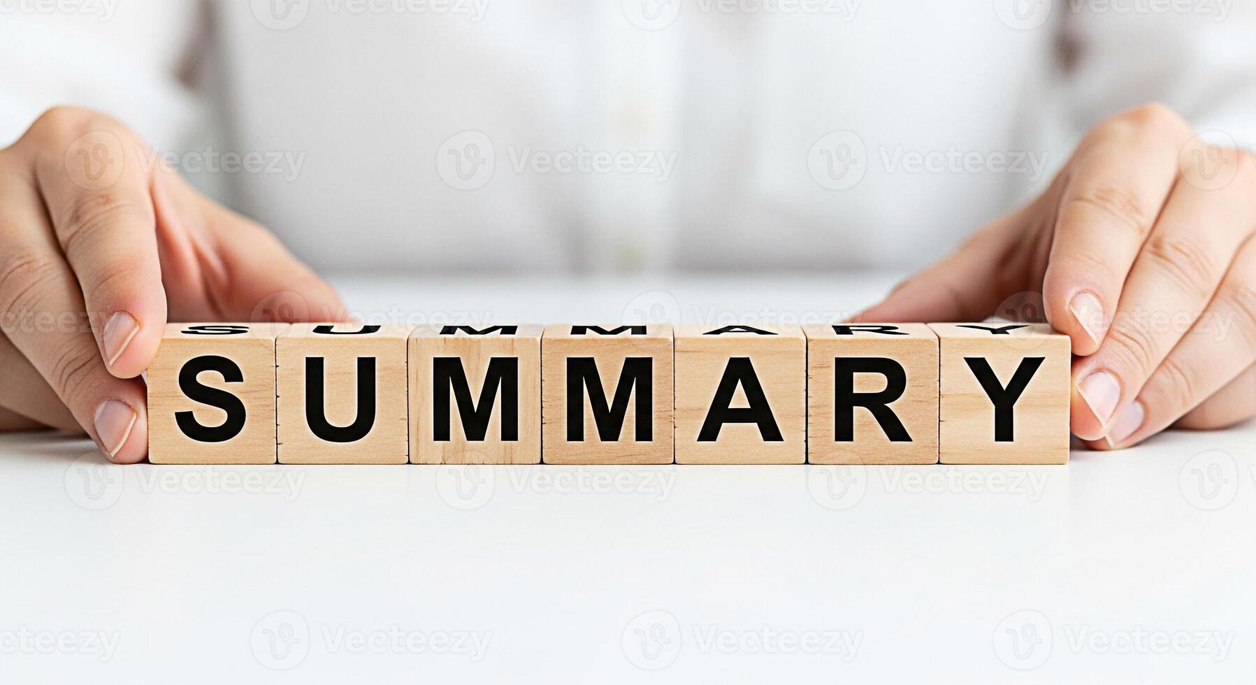 Hands arranging wooden blocks spelling SUMMARY on a white table symbolizing concise information and key takeaways in a clean minimalist setting conveying clarity and efficiency in communication Pro Photo
