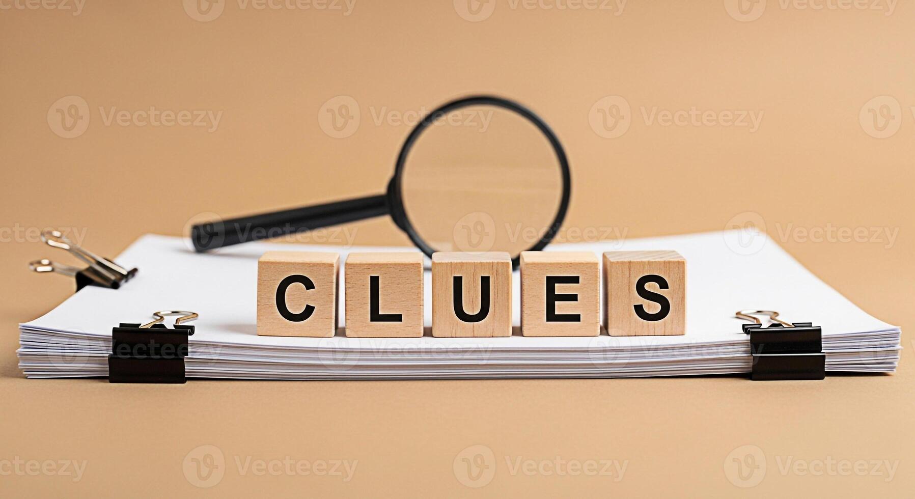 Magnifying glass hovering over wooden blocks spelling CLUES on a stack of papers suggesting investigation and problemsolving in a neutral studio setting creating a sense of mystery and intrigue Pro Photo