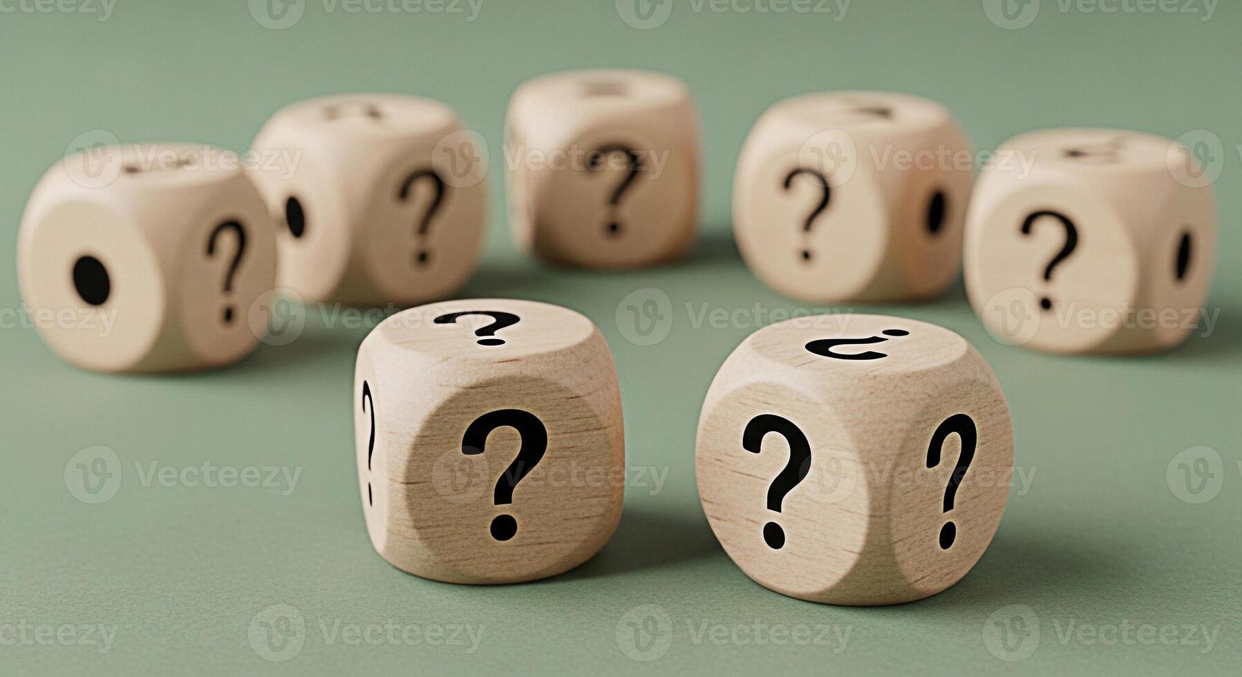 Wooden dice displaying question marks on a green surface representing uncertainty and the need for solutions in a business or personal context creating a sense of mystery and intrigue Pro Photo
