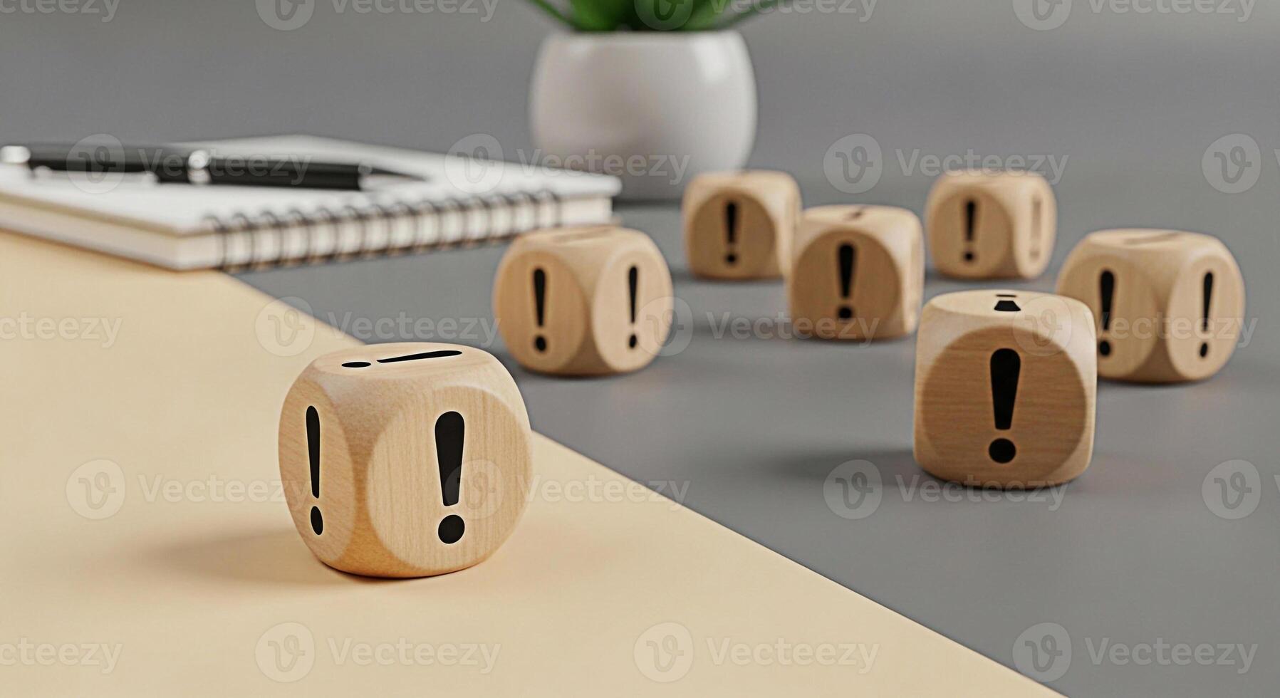 Wooden cubes displaying exclamation marks on a twotone desk symbolizing urgency and attention to detail in a modern office environment emphasizing the importance of critical thinking and problemsolvin Pro Photo