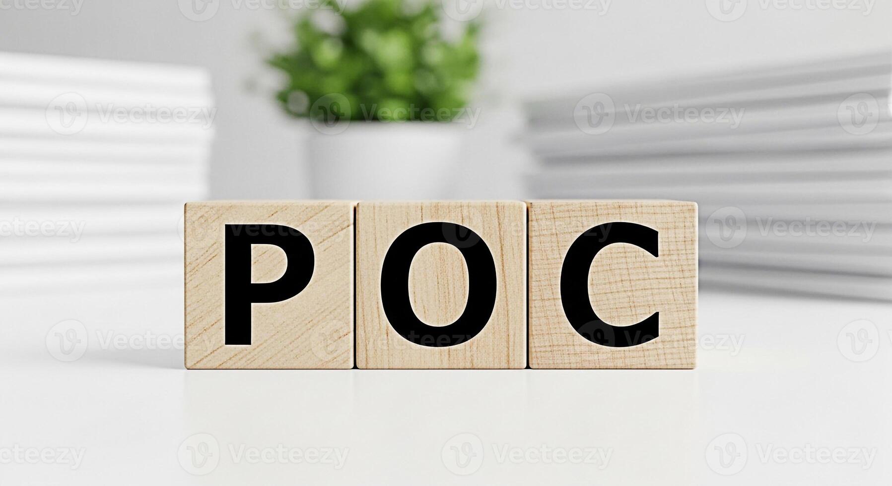 Wooden blocks displaying POC on a white table in a bright office setting representing Proof of Concept a business strategy for validating ideas and innovation fostering a sense of confidence and progr Pro Photo