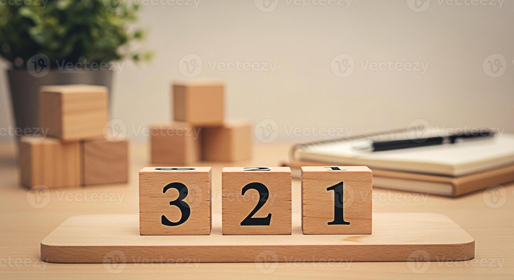 Wooden number blocks displaying 3 2 1 on a wooden surface in a bright minimalist office setting symbolizing countdown ranking and the beginning of a new project with a sense of anticipation Pro Photo