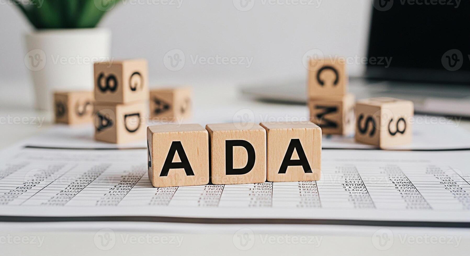 Wooden blocks spelling ADA on a financial document in a bright office symbolizing compliance with the Americans with Disabilities Act and promoting accessibility and inclusion in business practices Pro Photo