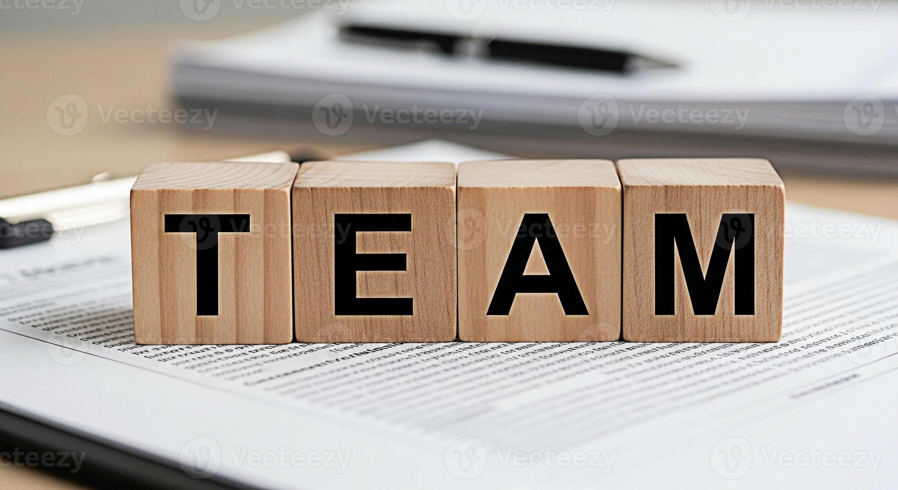 Wooden blocks spelling TEAM resting on a contract in a bright office symbolizing collaboration unity and the importance of teamwork in achieving business success and fostering a positive work environm Pro Photo