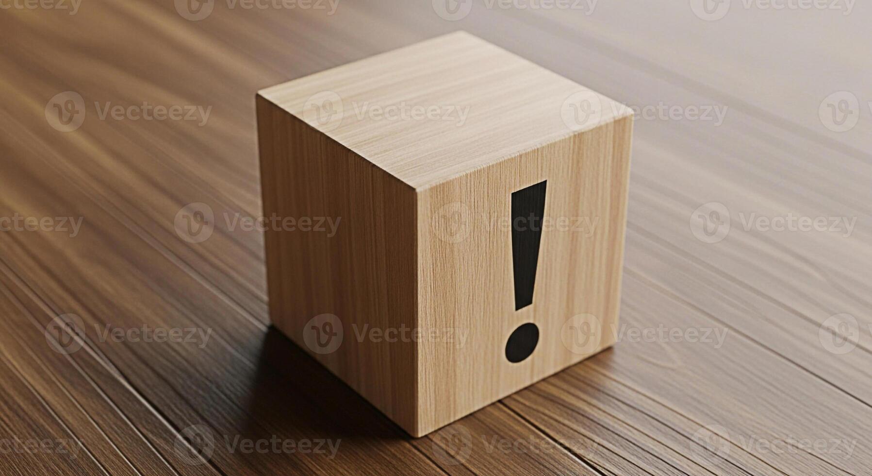 Wooden cube displaying an exclamation mark on a wood floor symbolizing attention warning and the importance of problemsolving in a natural and minimalist setting creating a sense of urgency and focus Pro Photo