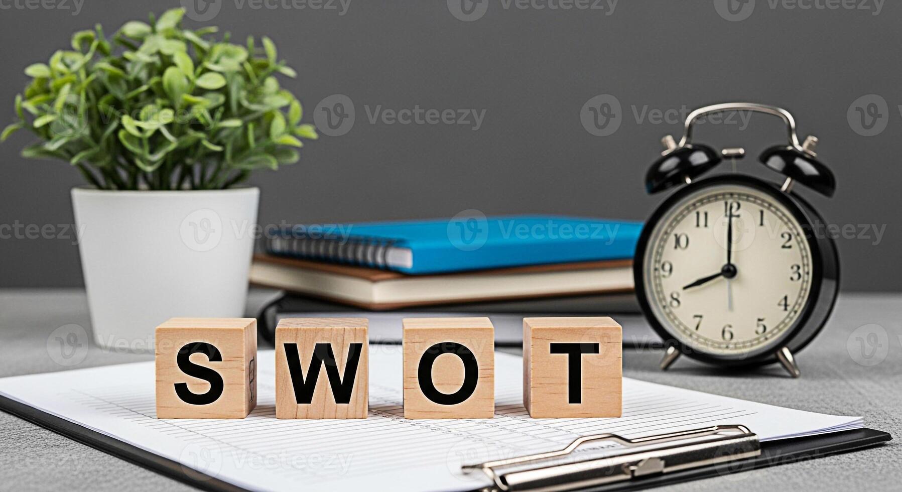 Wooden blocks spelling SWOT on a clipboard in a business setting representing strategic planning and analysis for business growth with a clock and plant adding a sense of urgency and focus Pro Photo