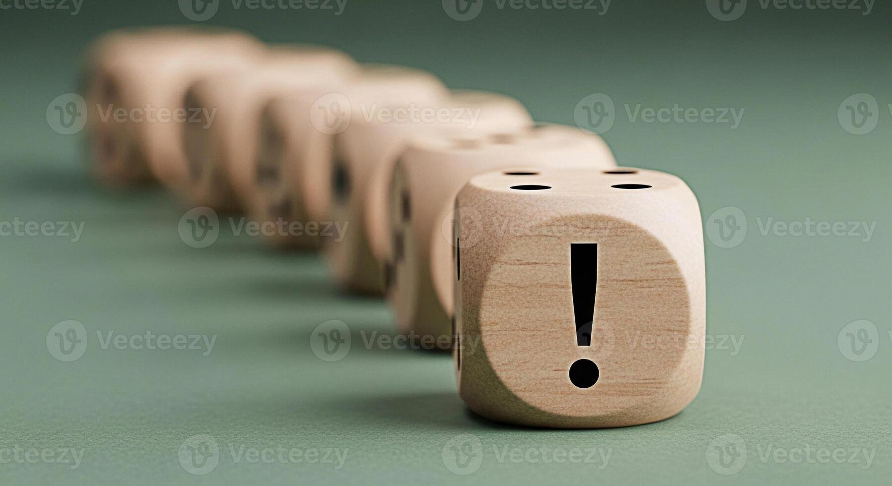 A row of wooden dice displaying an exclamation mark on a green surface symbolizing urgency and attention to detail in a minimalist and focused environment highlighting the importance of critical think Pro Photo