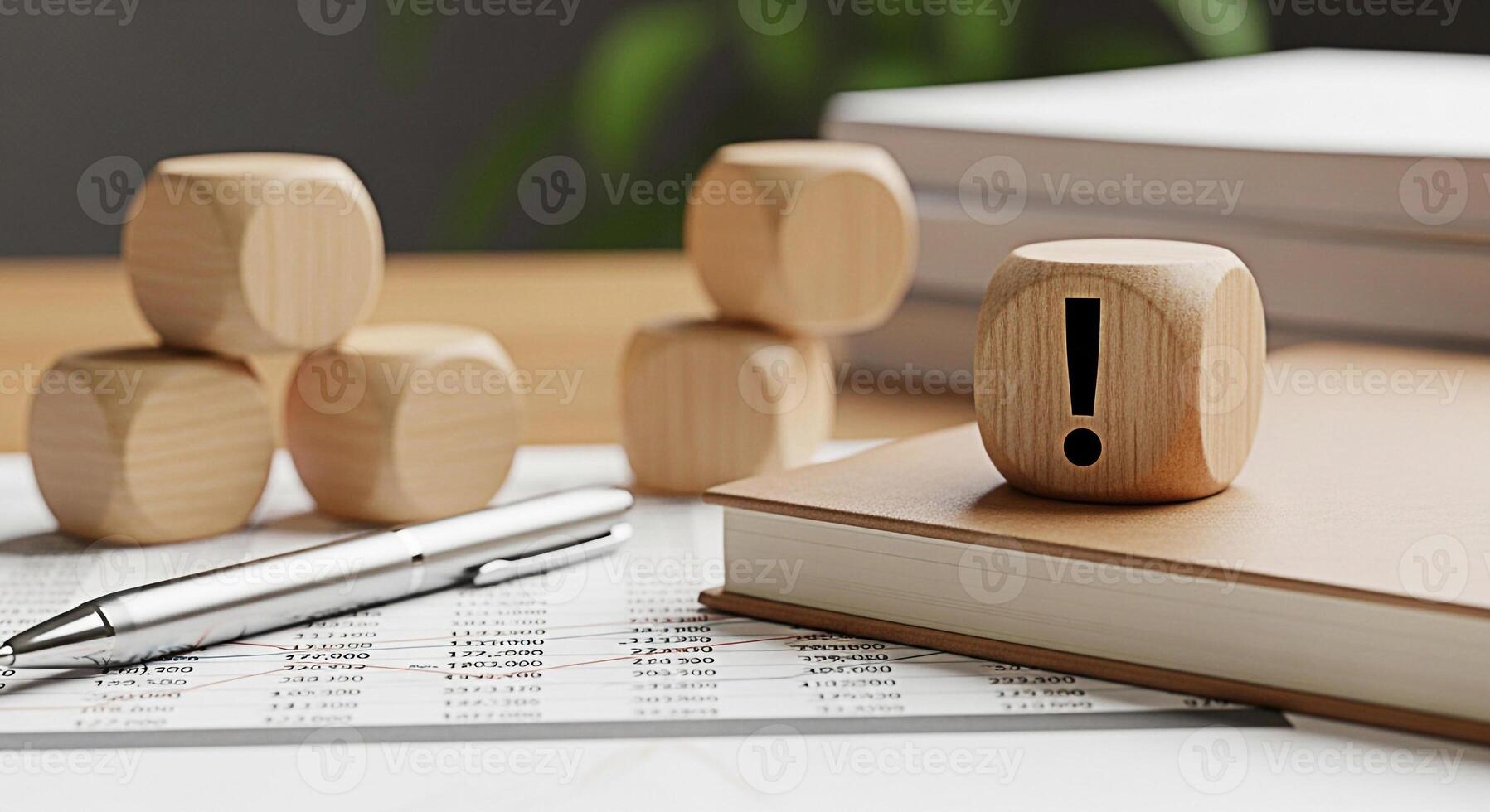 Wooden dice displaying an exclamation mark resting on a book in a bright office environment symbolizing attention to detail problemsolving and the importance of critical thinking in business and finan Pro Photo