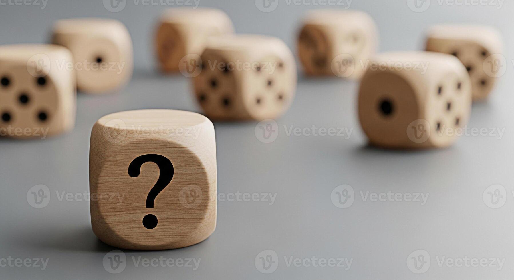Wooden dice displaying a question mark on a gray surface symbolizing uncertainty and risk creating a sense of curiosity and challenge in a minimalist studio setting ideal for business and educational Pro Photo