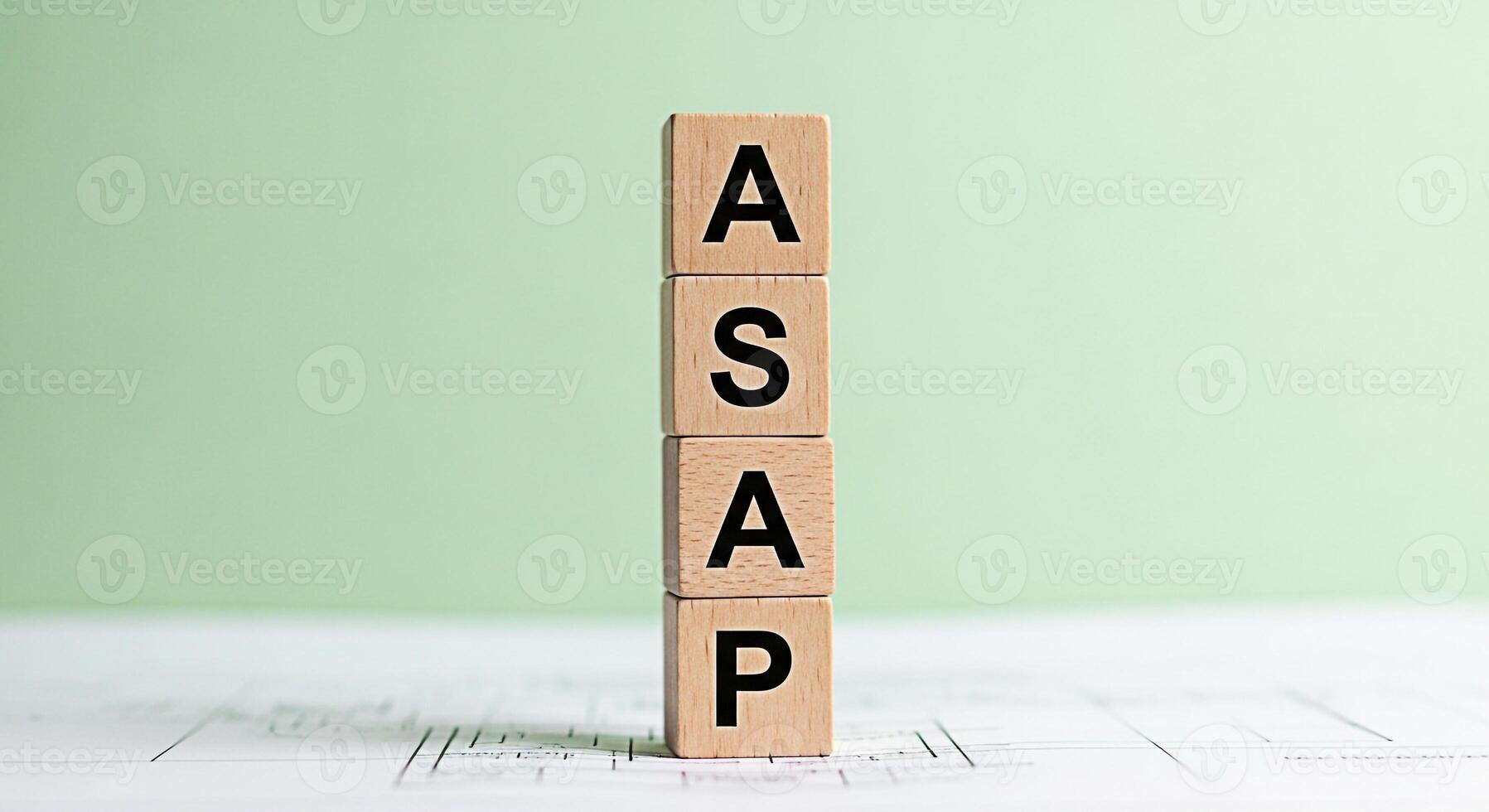 Wooden blocks spelling ASAP stacked on a blueprint against a pale green background conveying urgency and the need for immediate action in project management and business operations Pro Photo