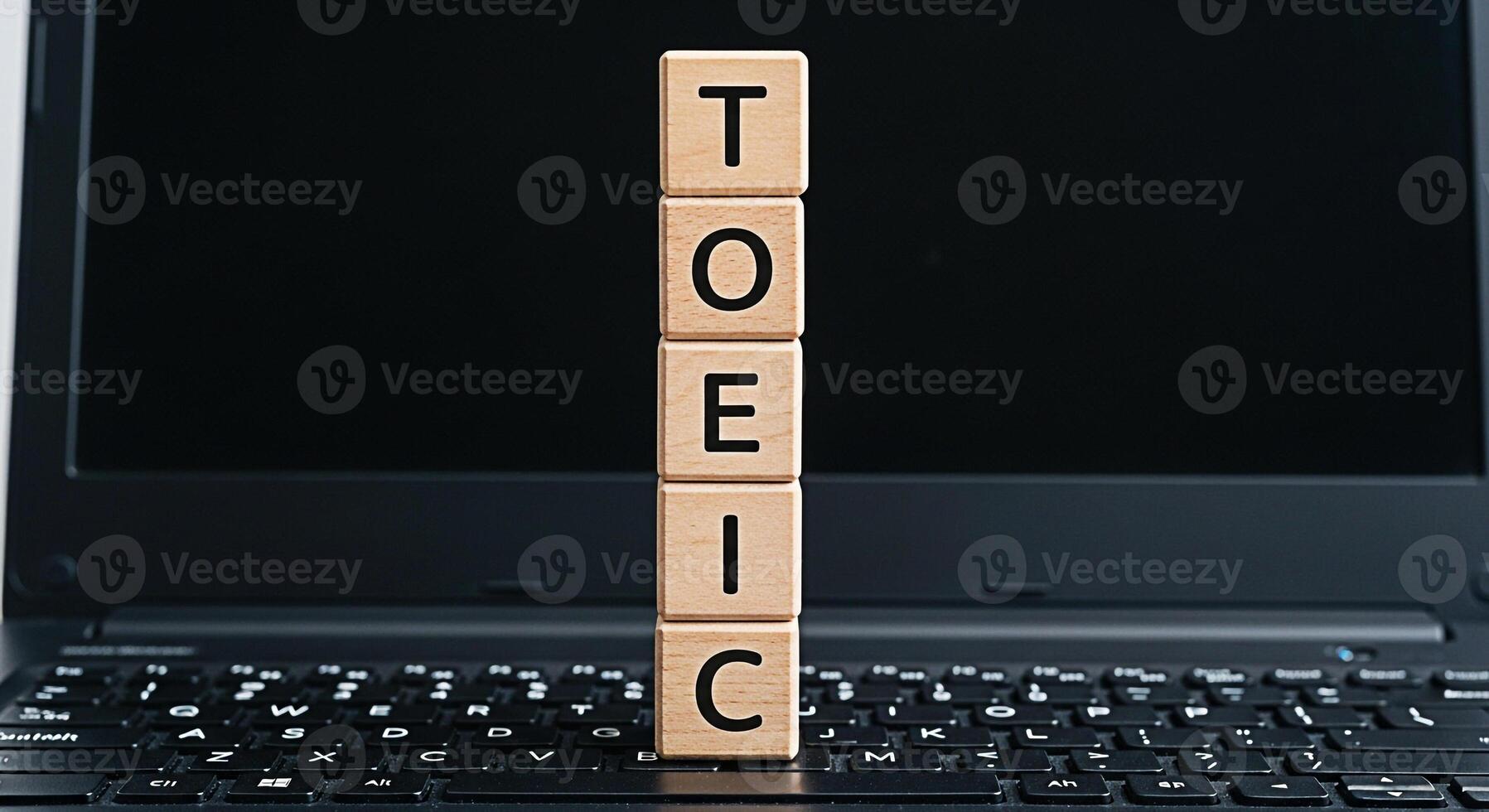TOEIC wooden blocks stacked on a laptop keyboard in a modern office setting symbolizing language proficiency and educational assessment for career advancement and global communication skills Pro Photo