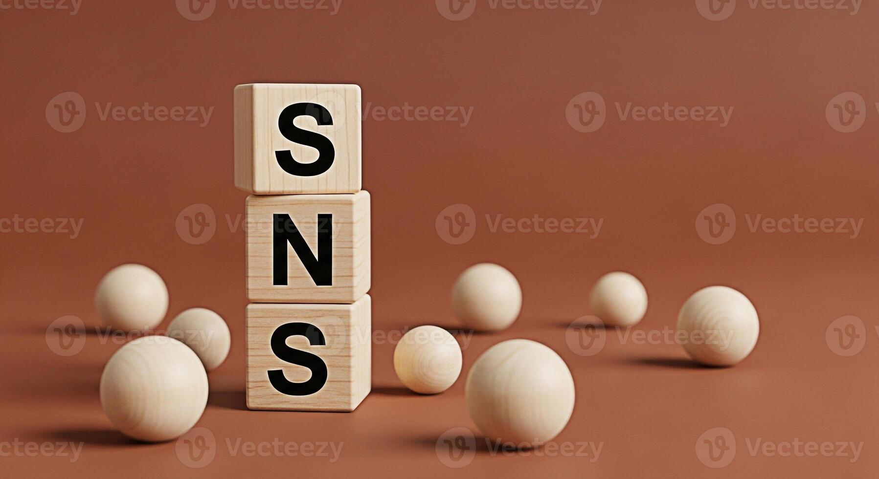 Wooden blocks spelling SNS on a brown surface with wooden balls representing social networking services and online communication in a minimalist and conceptual composition conveying connection and mod Pro Photo