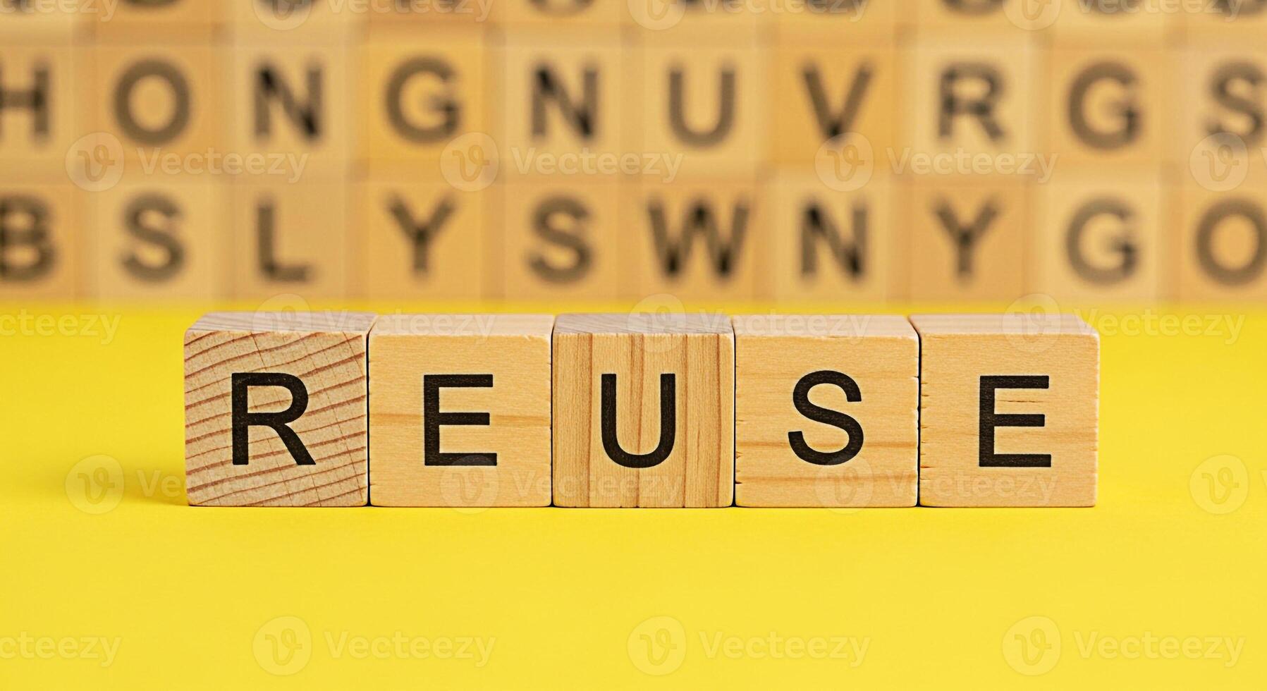 Wooden blocks spelling REUSE on a bright yellow surface promoting environmental awareness and sustainable practices in a simple impactful way emphasizing reduce reuse recycle for a greener future Pro Photo