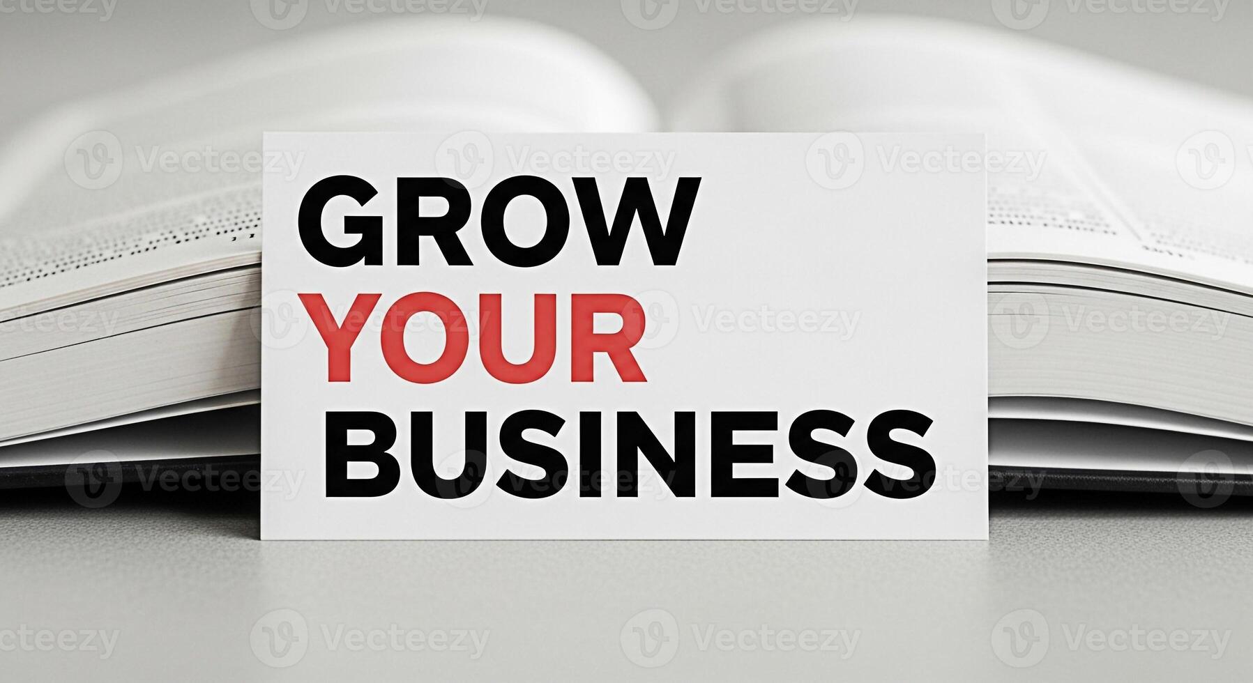 Business card displaying the message Grow Your Business placed in front of an open book on a white surface symbolizing business growth learning and the potential for success in a bright minimalist set Pro Photo
